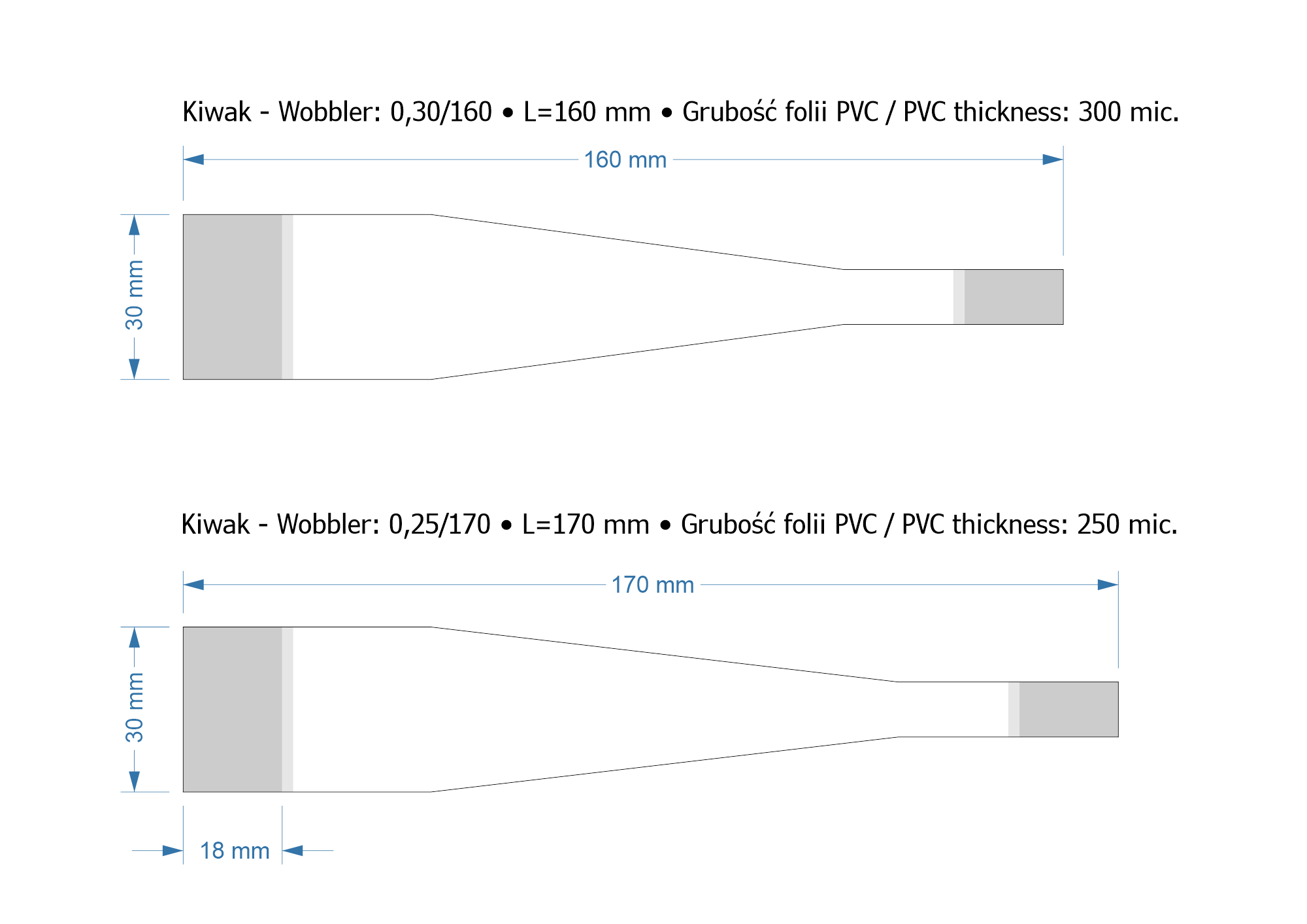 - do lekkich reklam: długość 170 mm, szerokość 30/10 mm, grubość folii 0,25 mm,